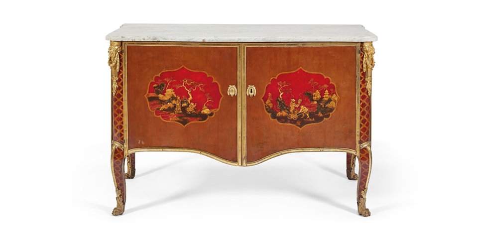 The first piece, a commode crafted in 1770 by Pierre Macret, demonstrated “one of the finest exponents of the façon de la Chine in France — or indeed in Europe,” according to Christies, adding, its “tôle-dorée doors, curved like rolling waves, feature bucolic chinoiserie landscapes: craggy Asiatic mountains, trees forked like lightning, standing figures in flowing robes.”