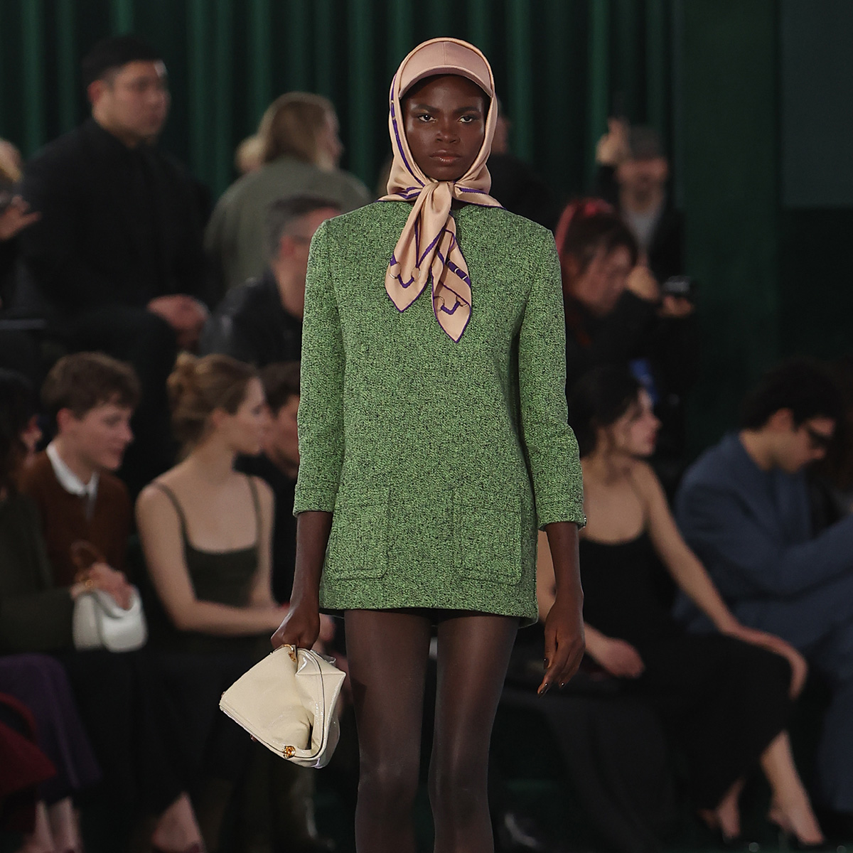 Although the collection traversed timelines and included nods to the 1970s and 1990s, there was an undeniable overtone of the mod style associated with the late ’60s. Tweed skirt suits showed up with shrunken three-quarter-sleeve blazers, leather driving gloves appeared in saccharine pink, and shift-dress silhouettes defined much of the runway, making more than a few references to Jackie O, a well-known Gucci muse.