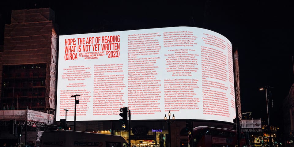 The 2023 CIRCA PRIZE calls out to artists of all backgrounds to submit work that they believe represents hope and responds to the platform’s 20:23 manifesto, Hope: The Art of Reading What Is Not Yet Written. Throughout September, 30 international artists will have their work shown across the digital screens of London’s Piccadilly Lights with the winning artist receiving a £30,000 GBP / $38,200 USD prize to go towards their practice, along with a trophy designed by Chinese artist Ai Weiwei. The jury will include Frank Bowling, Douglas Gordon, Anne Imhof, Michele Lamy, Shirin Neshat, Hans Ulrich Obrist, Josef O’Connor, Olu Odukoya, Norman Rosenthal and Pussy Riot’s Nadya Tolokonnikova.