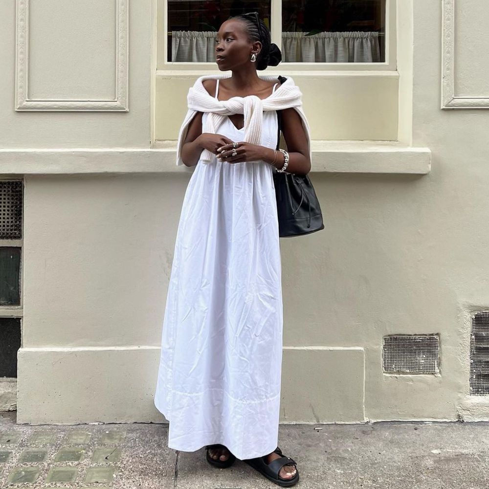 With the promise of a heatwave on the horizon (fingers crossed!), I took a look at some of my favourite stylish Instagram accounts for some inspiration on how to style my own white dresses with black sandals, flats and even heels. You might think that black shoes would look too harsh with your delicate white dresses, but the contrast between the two colours actually makes the outfit look effortlessly polished. And as both these pieces could be considered wardrobe staples with plenty of iterations around, there’s a myriad of styling options for the combo.