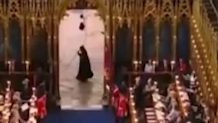 Military personnel were making their way into the ceremony where King Charles III was to be crowned, when the hooded person walked quickly past on-screen, clutching a scythe-shaped object.