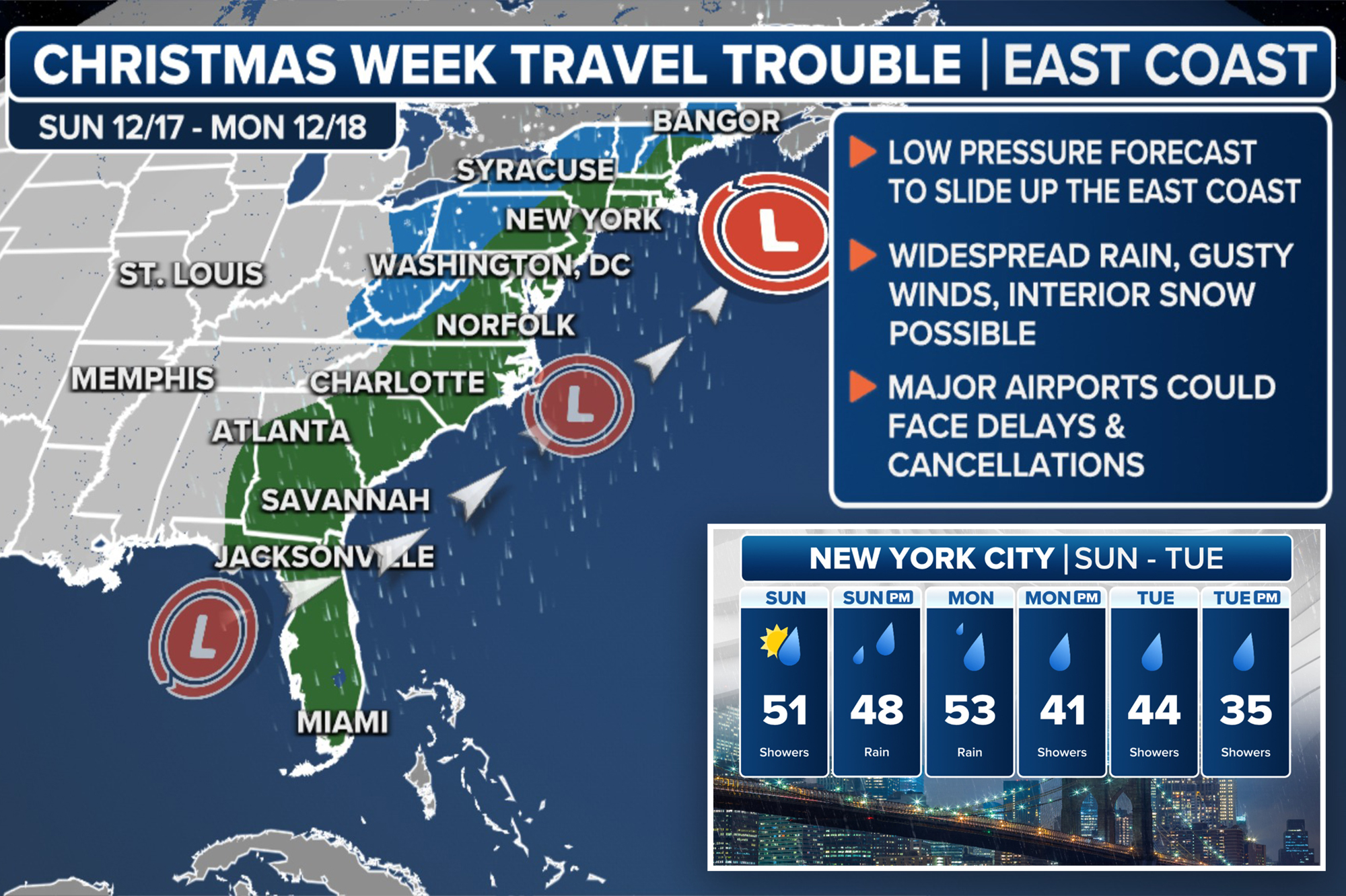Those along the Interstate 95 corridor hoping for snow to see a white Christmas won’t be in luck with this system as this is expected to be a rain-only event for the major cities, including Boston, New York City, Philadelphia and Washington.