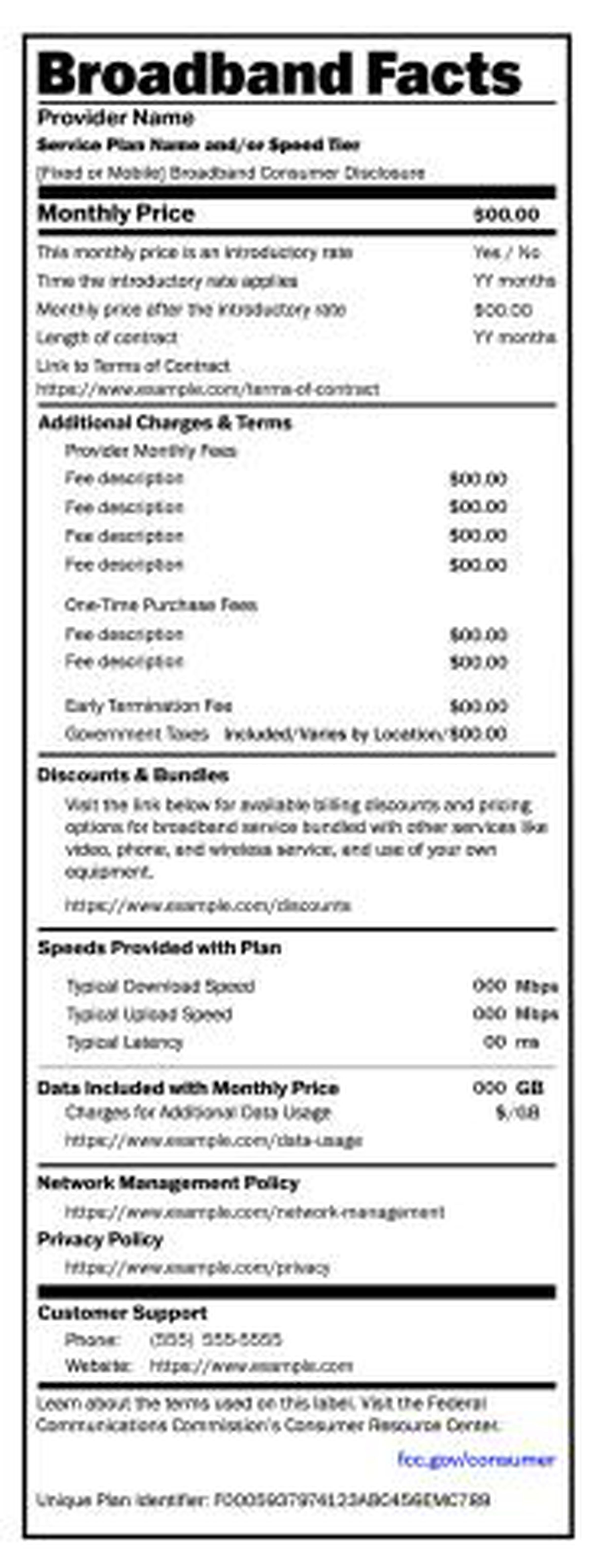 The next time you shop for either a standalone home or fixed internet plan, or a new mobile broadband plan, you should notice such a label. Each label will include monthly broadband prices, introductory rate details, data allowances, broadband speeds, and links to find out about any available discounts or service bundles. Links to network management practices and privacy policies should be listed as well. The labels should appear both online and at physical stores.
