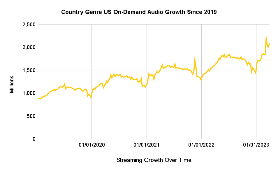 The genre regularly thrives in live music spaces where fans can discover new artists in country halls, bars and tours but before 2020, the genre had little significance on streaming. Instead, listeners opted for more traditional sources like album sales, which make up a much larger share of country music’s consumption compared to chart-topping genres.