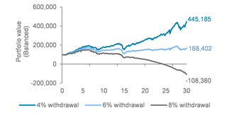 *Balanced portfolio value at varying withdrawal rates over a rolling 30-year retirement period since 1871; starting with USD100,000