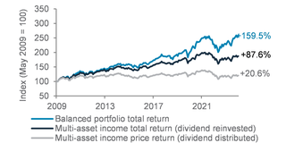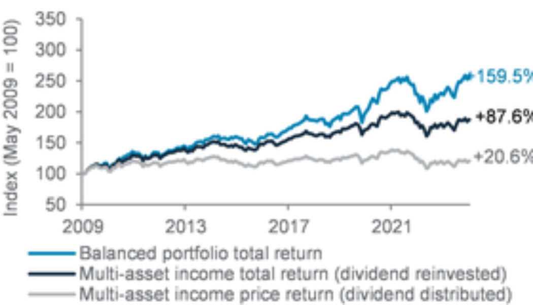 Cumulative returns of total return and price return of a diversified income allocation* vs total returns of a balanced allocation** (May 2008 to May 2024)