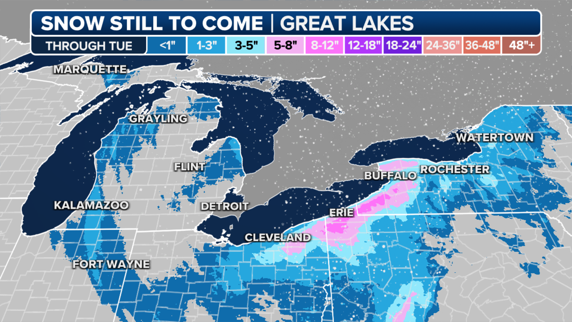 The lake-effect snow will turn much lighter on Tuesday and gradually come to an end downwind of the Great Lakes.