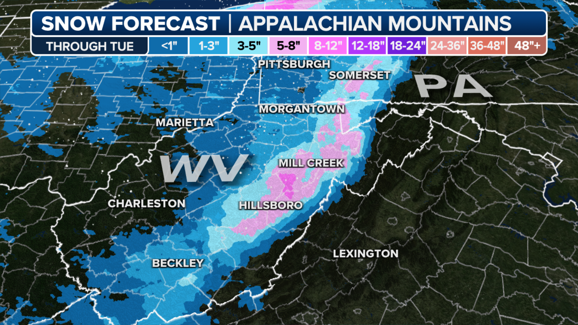 However, heavy snow is expected to continue over the Appalachians of West Virginia and southern Pennsylvania through Tuesday. The northwesterly upslope flow will dump a foot or more of snow over the higher terrain.