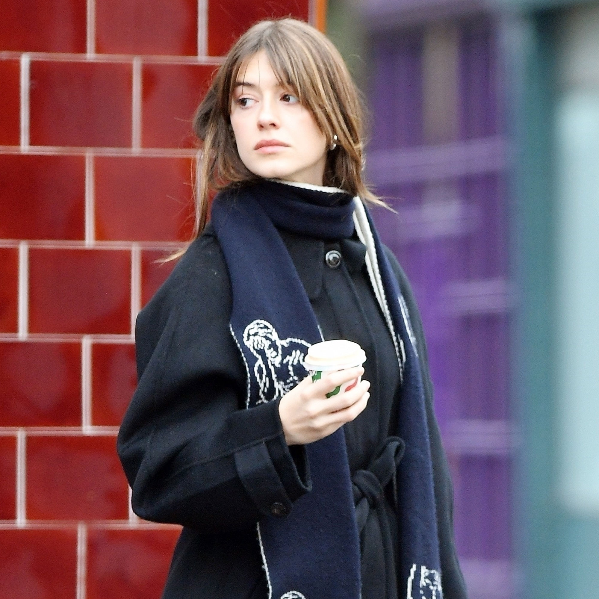 On Daisy Edgar-Jones: Mango Wool Coat ($230); Hades scarf; Birkenstock Birko-Flor Slide Sandals ($110)