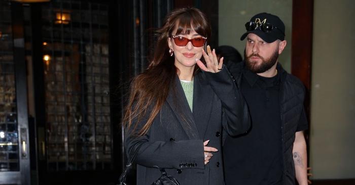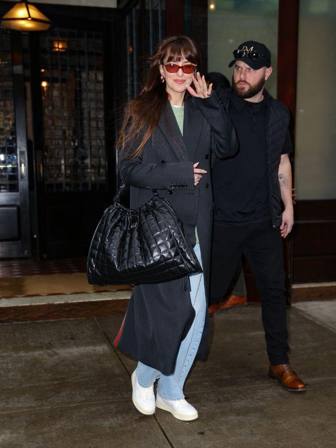 Dakota Johnson carried a relaxed handbag style that, the more I looked at it, I was sure I had seen before. Opting for a large black bag in a quilted leather fabric from Gucci, Johnson styled her oversized tote with a longline structured coat and light-wash jeans. Adding a practical element to her casual look, Johnson’s quilted bag was large enough to stow away her essentials but neat enough to retain a polished edge.