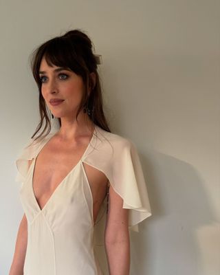 Making her red-carpet ensemble feel all-the-more ceremonial, the actor styled her look with drop earrings and an ivory hair bow. Indeed, from head-to-ankle, Johnson nuptials-inspired look was Pinterest-board-perfect. However, what came next is also worth highlighting.