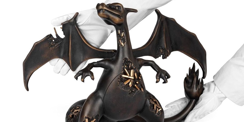 Continuing his longstanding partnership with Pokémon, Daniel Arsham has revealed his latest sculpture from the fictional universe, creating a BRONZE CRYSTALIZED CHARIZARD sculpture reimagined as a relic of Kanto which has been uncovered through the passage of time. While Arsham has created eroded Charmander figures and PINK CRYSTALIZED CHARIZARD Pokémon cards in the past, the artist’s new cast bronze Charizard sculptures are hand-finished in custom black oil patina for the first time. Crystals are individually polished for a reflective glaze.