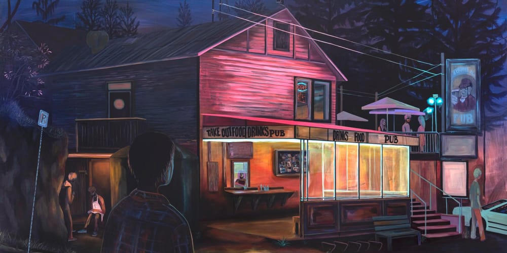 At the heart of each uncanny, everyday scene is the hum of artificial light — iridescent halos around car headlights, vibrant disco balls that silently spin and overhead lamps hung above disillusioned, Hopper-like gatherings. Despite roaring radiance, each face is adorned in a set sunken eyes and dull expressions. This dark and resonant irony of each work beckons the viewer and dares to hold them at distance, “like stepping outside a party but still hearing the music inside,” the gallery writes.