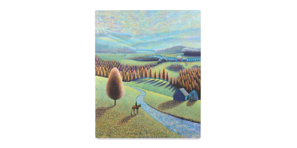 All around the Wrekin highlights Smith’s ongoing exploration of the English pastoral tradition, reimagined through radiant color and layered brushwork. His creative process involves painting large-scale canvases on heavily woven herringbone linen, a deliberate choice that pays homage to his family’s heritage. While his scenes evoke the spirit of Norwich School painters, he transforms the familiar English countryside with what has been described as a hallucinatory, technicolor vision.