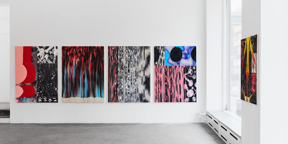 The artist is currently the focus of a solo show called Energized at Gallery Steinsland Berliner in Stockholm, Sweden. On view through April 5, the presentation features a bold selection of abstract pieces. One work looks like it’s on fire, entangled in a forest of wispy flames set against a black backdrop. Another painting, seemingly features a stack of spliced bio matter, or if you were tilt your head to the right, it could appear as a distorted landscape from a horror movie that you can only find on VHS.