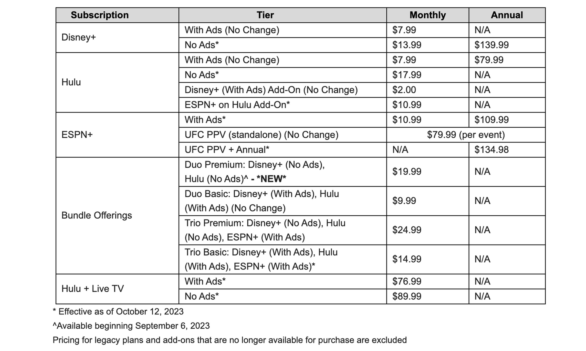 The triple play of Disney Plus (no ads), Hulu (no ads), and ESPN Plus (with ads) will also be increasing to $24.99. Hulu with Live TV with ads is rising to $76.99, with the commercial-free version jumping to $89.99 per month from the current $82.99.