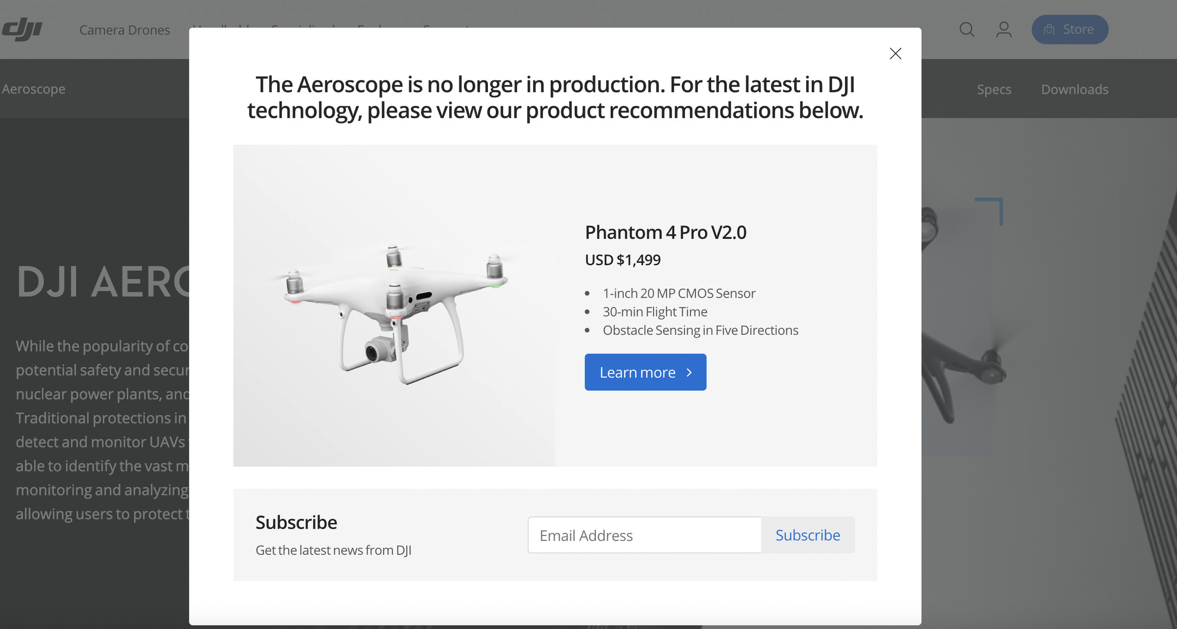 You can close out of the notification and view the entirety of AeroScope’s product page, which still has an order form for DJI dealers at the bottom. The China-based DJI hasn’t formally announced the discontinuation of the product, and it’s still not clear whether existing AeroScope devices will lose functionality, or if the platform’s going away forever. According to UAV Hive, rumors indicate that DJI’s working on a second version of the receiver, however, DJI didn’t immediately respond to The Verge’s request for more information.