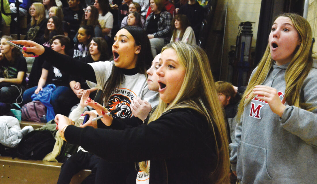 Howland High School seniors McKenzie Maiorano, 18, center, Grazie Pishotti, 18, left, and Jessie DeSalvo, 17, right, cheer on the teams during the school’s annual dodgeball tournament to support the American Heart Association in honor of Heart Month, which is in February. The tournament was organized by the Howland High School Student Senate, of which Maiorano is president.