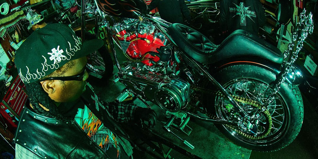 The Harley-Davidson bike, which took over 2,000 man-hours to produce from scratch, blends in with Toliver’s larger Hardstone universe with Frisco-style skinny tires, a custom gun-fighter seat and two fire-engine red cylinders. A ’90s-inspired chainlink riffs on Toliver’s own wallet chain, which he brought to Powerplant’s garage for their first meeting, while ’70s-coded design details, like patinated paint jobs and Hardstone-engraved rocker boxes, complement the bike’s own history.