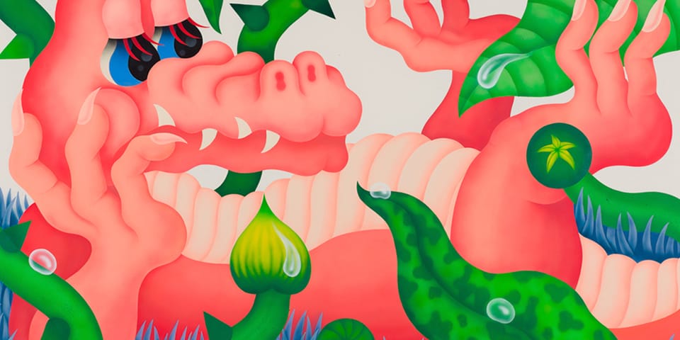 Rising Spanish artist Fátima de Juan has unveiled her latest series of paintings with frequent collaborator, L21. Housed at the gallery’s Barcelona location, Don’t Disturb Me, I’m Blooming casts visitors down a rabbit hole-themed exhibition, where surreal pop-induced humans and animals populate the largely blue and green walls of the space.