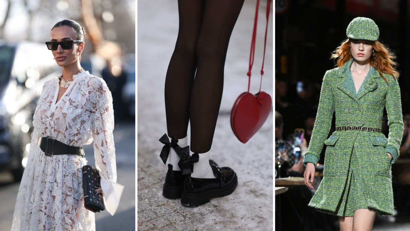 From left: A Paris Fashion Week guest demonstrates subtle elegance offset with standout accessories; black tights and cotton socks with black bows paired with Liu Jo black loafers; Chanel’s take on ‘eclectic grandpa’ for women. Getty