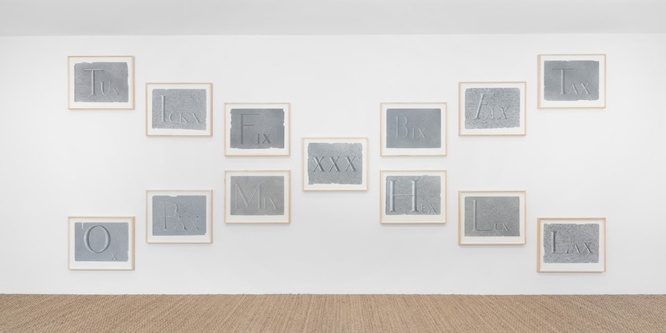 In a new exhibition at Gagosian‘s Saanen location in Switzerland, Ruscha has created a new series of typographic studies on paper, entitled “Dedication Stone.” Each monochromatic drawing is a different rendering of a short word or symbol containing the letter x. Ruscha refers to this letter as the ultimate variable, one which is infinitely adaptable to carrying ideas.