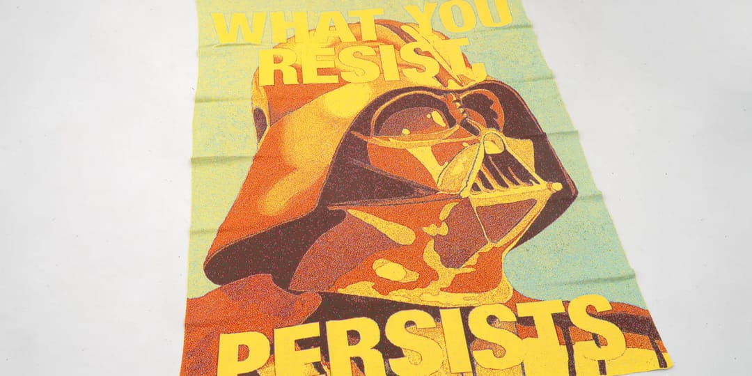 VATHER RESIST (2024) is another standout in the collection, featuring Star Wars’ chief villain in a sun-kissed color palette with the words ‘WHAT YOU RESIST PERSISTS’ overlaid on the image. “Feeels like spring is in the air, but still it gets a bit chilly in the evening,” König says, offering the answer through his large blankets that can see year-round use.
