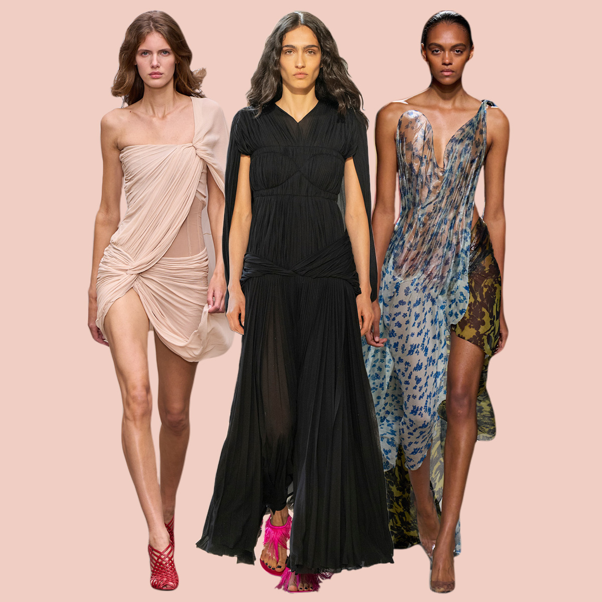 This season, draping proved to be one of the most present fabric techniques on the runways, tying back to a larger aesthetic we called “craving romance” that features an abundance of sheer and chiffon fabrics, soft florals and colors, and, of course, wispy draping. At Stella McCartney, the trend took shape in the form of minidresses in a variety of colors and lightweight materials. Tory Burch continued the trend with sheer silk blouses in white and mauve that were styled alongside ruched trousers in an almost NSFW fashion. Perhaps most impactful were the sculpture-like tops and dresses at Victoria Beckham’s show, which appeared to be molded to each model’s skin like papier-mâché or clay.
