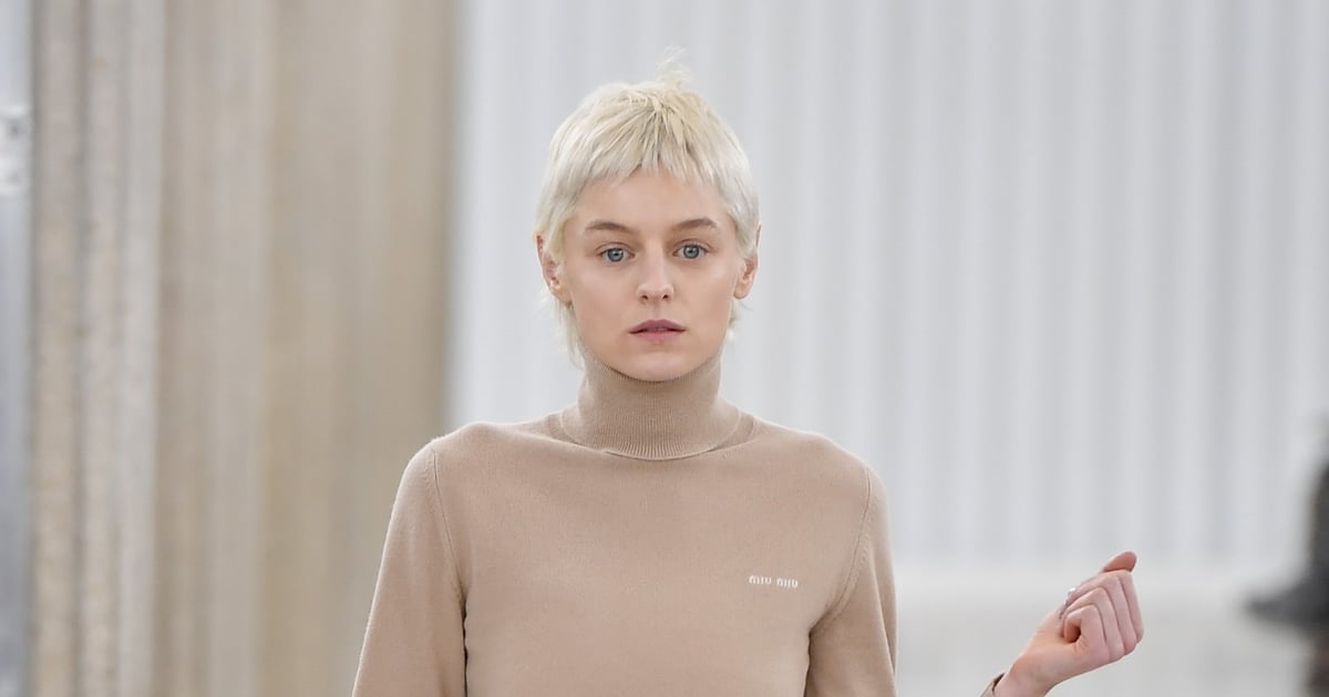 The actor closed the Miu Miu show wearing a beige roll-neck jumper with gold sequin knickers, sheer tights, orange peep-toe shoes, and carrying a black box bag. Their platinum-blonde mixie crop was left fluffy, while smokey eye makeup and dewy skin were the order of the day in the beauty deaprtment. The show was adorned with models in sequin knickers, as the Italian brand made a point of supporting the trouser-less trend, which has been popular among the likes of Maya Hawke and Kylie Jenner of late.