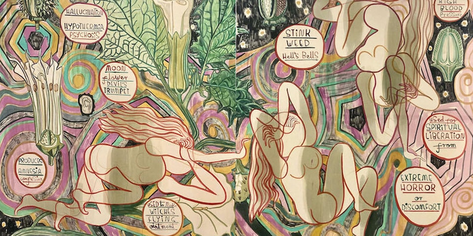 For the upcoming fair, Talbot will install a 28-meter-long (roughly 92-feet) painted silk hanging garden titled 21st Century Herbal at the entrance. The artist notes that piece was inspired by medieval manuscripts that describe plants and their properties, from well-known medicinal remedies, toxic plants, as well as pop culture references rooted in little-known botanical facts.