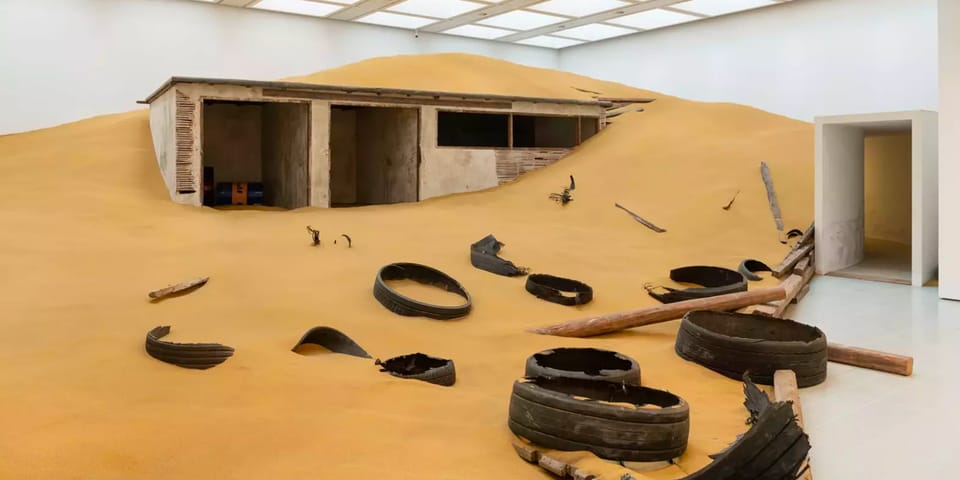 As the name suggests, Extinction Beckons is both atmospheric and distressing. Like a scavenger in a dystopian world, Nelson created a labyrinth of rooms made of materials found in junk shops, auctions and flea markets, reminiscent of science fiction, and commenting on the failed promises of modernity and political movements.