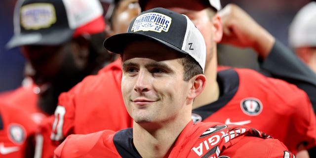 Stetson Bennett #13 of the Georgia Bulldogs celebrates after defeating the LSU Tigers in the SEC Championship game at Mercedes-Benz Stadium on December 03, 2022, in Atlanta, Georgia. (Kevin C. Cox/Getty Images)