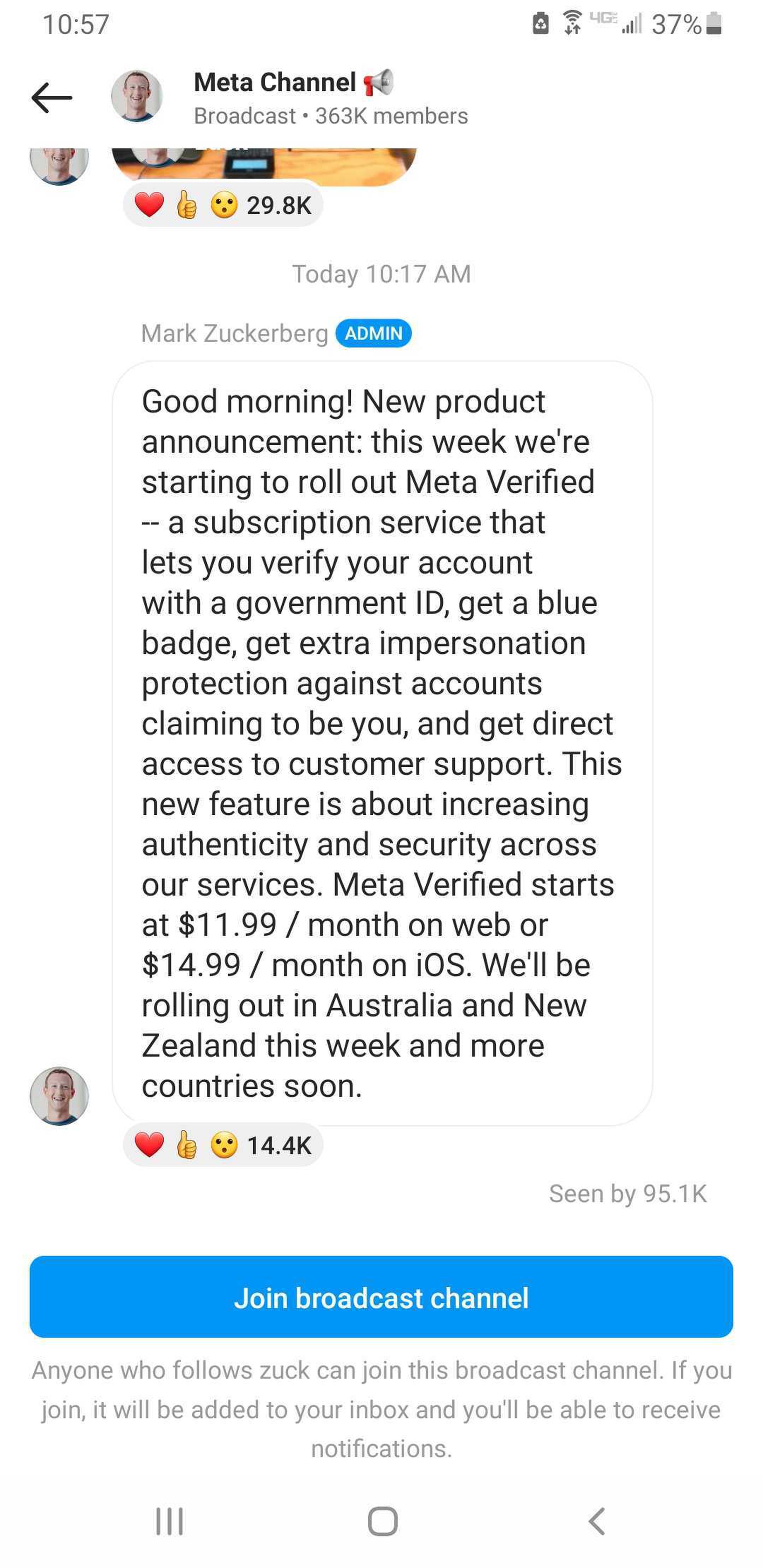 “This week we’re starting to roll out Meta Verified — a subscription service that lets you verify your account with a government ID, get a blue badge, get extra impersonation protection against accounts claiming to be you, and get direct access to customer support,” Zuckerberg writes. “This new feature is about increasing authenticity and security across our services.”
