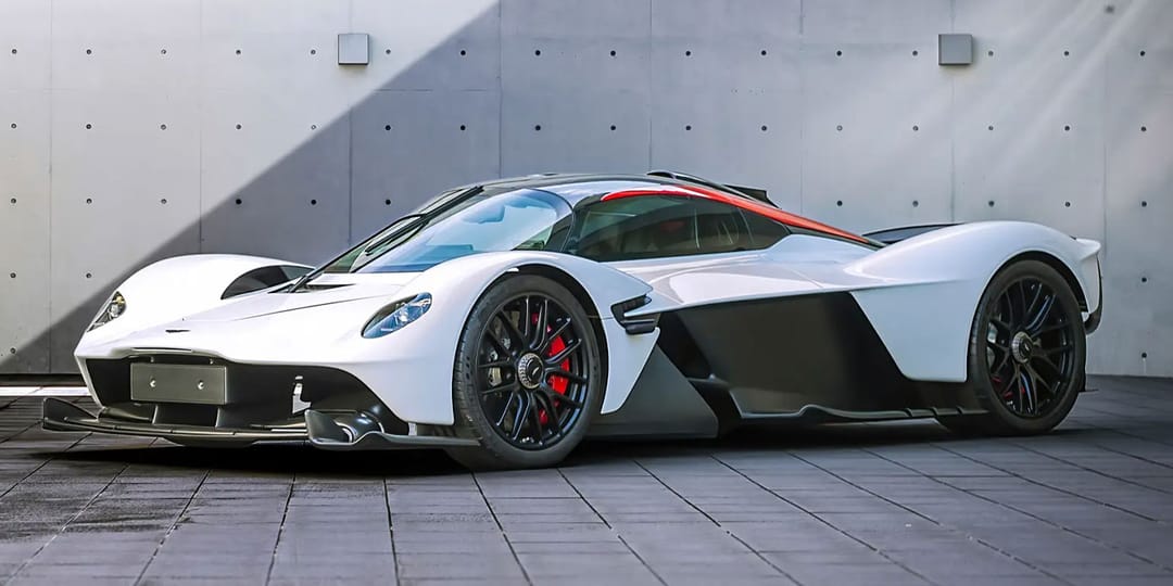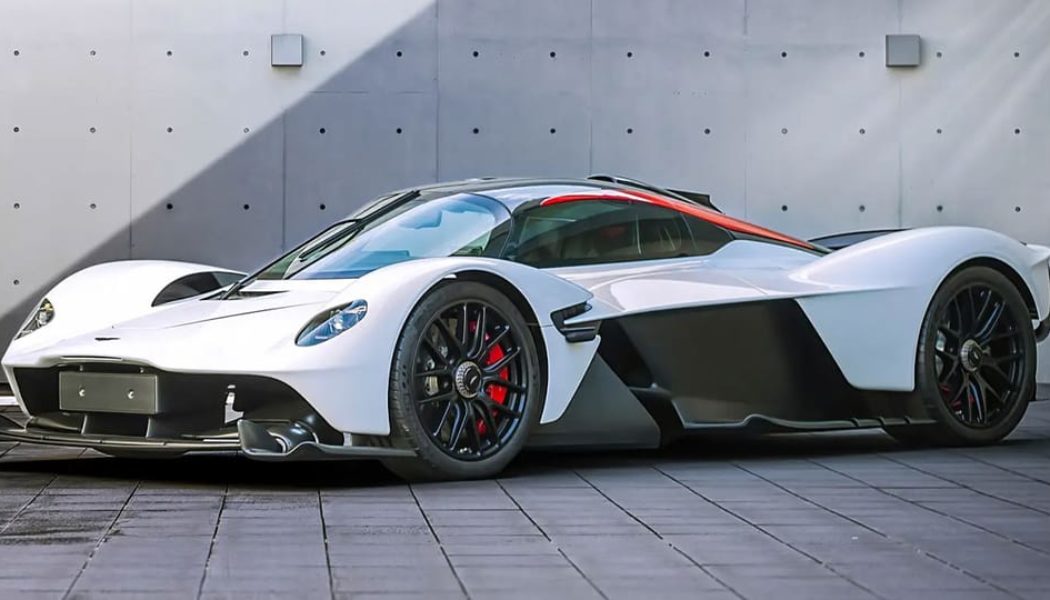 The Valkyrie is finished in Lunar White with striking red graphic accents, a gloss carbon roof and a Pure Black Alcantara interior featuring bold Spicy Red stitching. Under its futuristic design lies a Cosworth V-12 engine, assisted by an electric motor, generating an impressive 1,160 hp. This powertrain enables the car to reach 60 mph in just 2.6 seconds, with a top speed exceeding 250 mph.