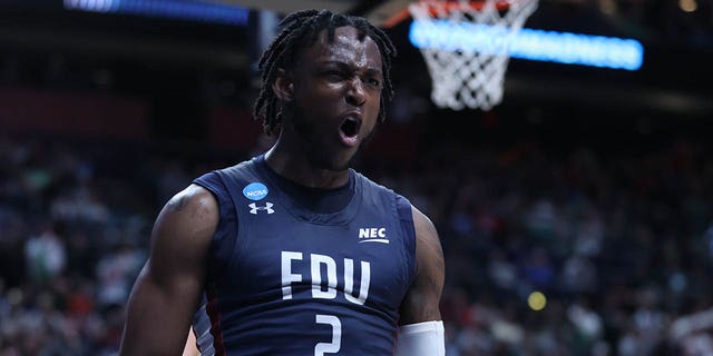 Demetre Roberts of the Fairleigh Dickinson Knights reacts to making a play against the Purdue Boilermakers during the first round of the 2022 NCAA Tournament at Nationwide Arena March 17, 2023, in Columbus, Ohio. (Tyler Schank/NCAA Photos via Getty Images)