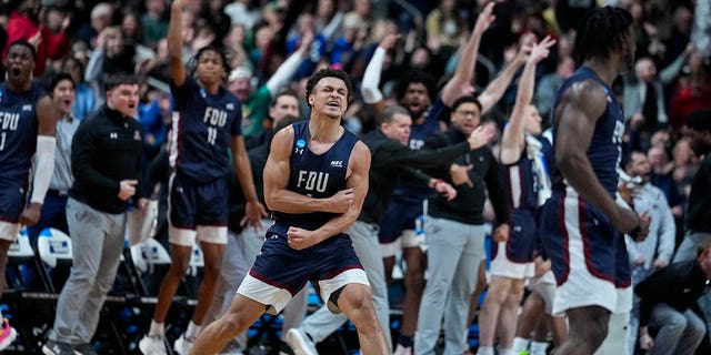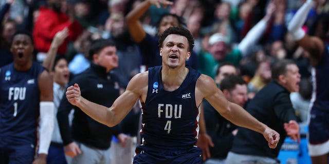 Fairleigh Dickinson guard Grant Singleton (4) celebrates after a basket against Purdue in the second half of a first-round game in the men’s NCAA Tournament in Columbus, Ohio, Friday, March 17, 2023. ( AP Photo/Michael Conroy)