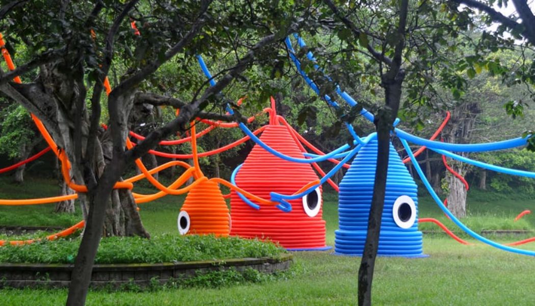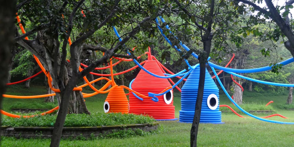 Found along the rim of Zhiqing Lake, the interactive installation features three life-size colorful squids — small, medium and large — symbolizing the typical Taiwanese nuclear family. With tentacles outstretched and interwoven in trees, the family of creatures emerge from the grass. While the artwork serves as an acoustic play space during the day, “Squid Squad” engulfs the park in a soft light of red, orange and blue, creating an illuminated ambiance after the sun sets.