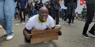 Kenyan activist Ojiro Odhiambo protests against the Finance Bill, 2024 at Kimathi Street, Nairobi on June 18, 2024.