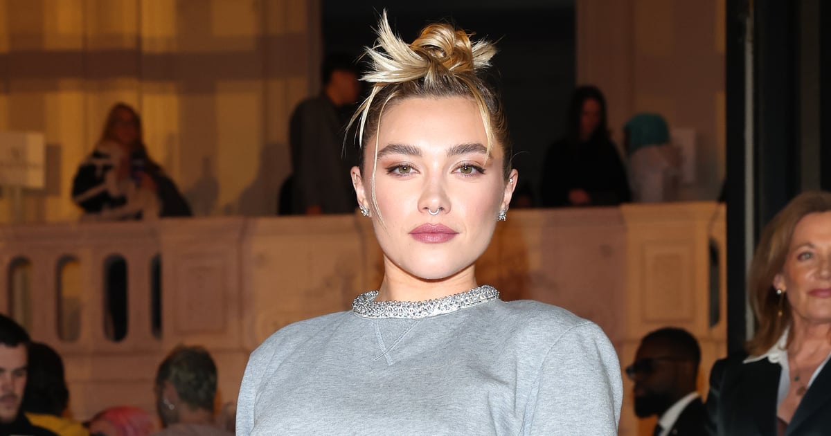 Florence Pugh continues her reign as our 2023 style muse. Fresh from opening the Harris Reed show at London Fashion Week, the “Don’t Worry Darling” star sat front row at Valentino’s autumn / winter show at Paris Fashion Week on 5 March wearing a totally sheer sequinned maxi skirt that exposed her thong underneath. Her ensemble was an outfit of two halves, wearing a grey cropped sweatshirt on her top half to offset the naked skirt as she rubbed shoulders with Nick Jonas and Priyanka Chopra, and the Peltz-Beckhams at the prestigious event.
