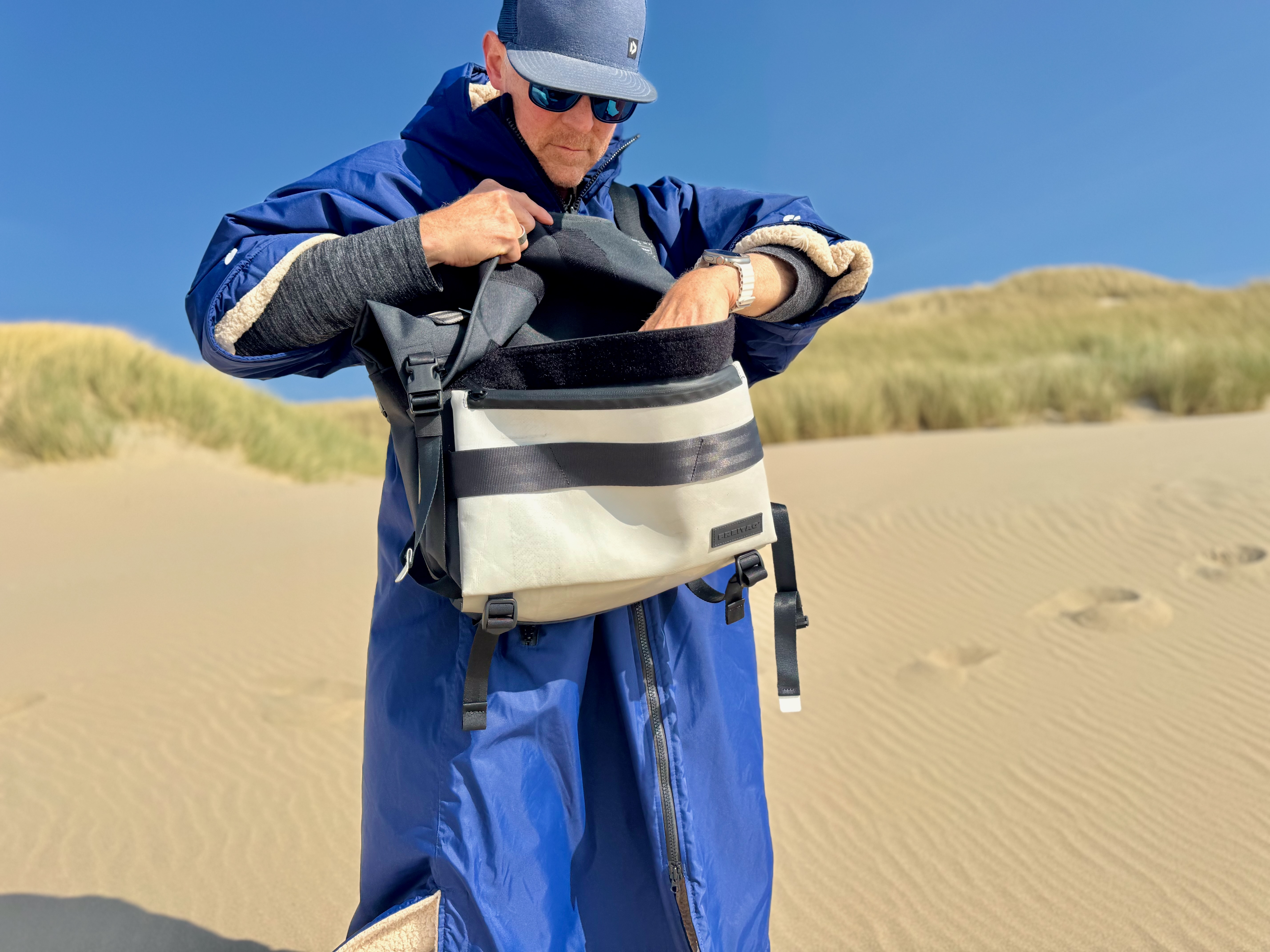 You can also secure the bag against your body with a three-point strap. This worked very well, but it isn’t really needed on Amsterdam’s protected bike lanes, where I don’t have to dodge in and out of cars. The bag is accented with reflectors from recycled truck contour markings, which help with visibility at night.