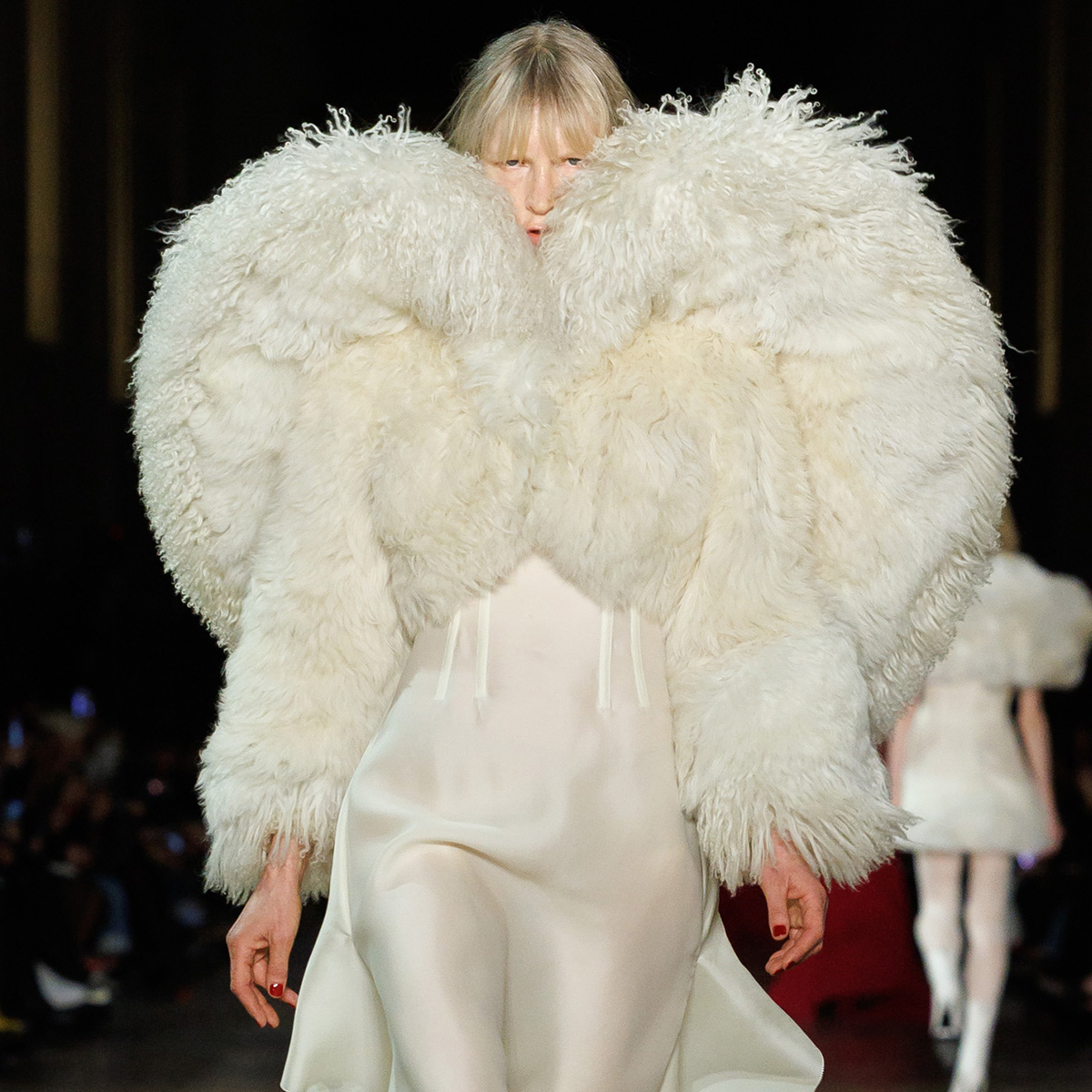 It began dark, with a total of six black, trim suits and coats, all of which were fitted to perfection and sculpted in all the right places. Victorian ruffled sleeves and peek-a-boo black lace added to the drama of the otherwise understated separates, as did sharply pointed lace-up boots. Stars of the collection included silk-and-shearling toppers that were made to look like wings, striking collars from a long-ago age, and beautifully constructed corsets.