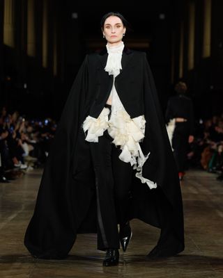 “London, by night,” the press release reads, which explains starting off the show with a total of 13 ensembles that aren’t just black in color, but dark in energy as well. Darkness and emotion are the McQueen way, after all, so it’s hardly surprising to see a sense of ornamental gloom make its way into McGirr’s offering for the season. The use of blood red for languid, flowing dresses and rich jacquards on sharply tailored suits likewise felt fitting for the house. It was the lightness of other looks—a translucent, silk georgette gown in lilac with a lace ruff and cream, silk corsetted minidress featuring an enormous silk organza and natural shearling bolero—that offered just the right amount of soft, ethereal energy to the collection, thus creating a perfect balance.