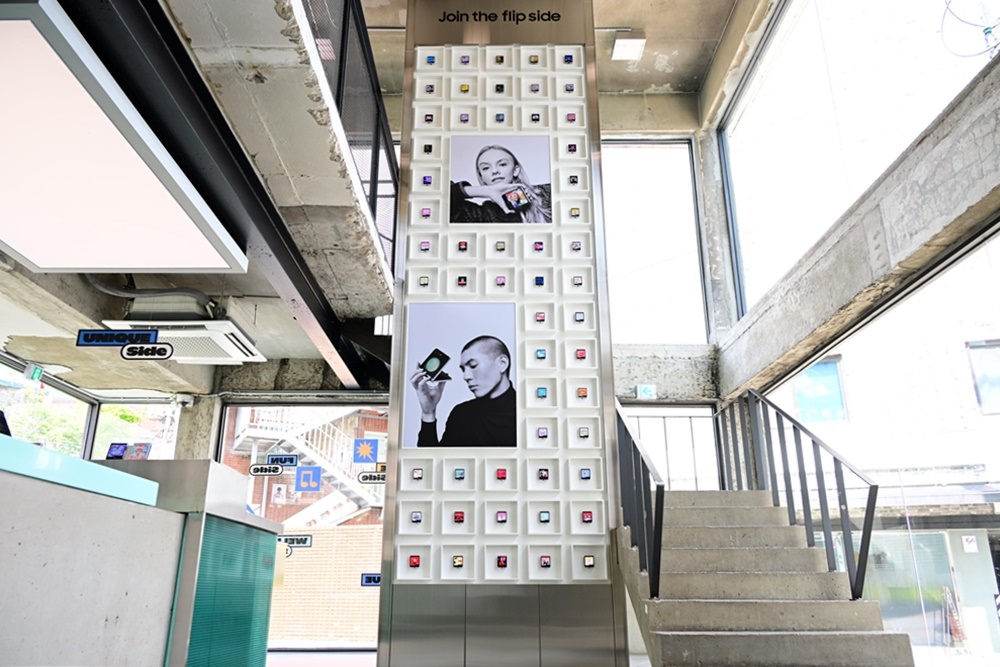 Upon entering the first floor of Flip Side Market Seongsu, visitors are welcomed by a large wall that utilizes the Galaxy Z Flip5. The display showcases the larger 3.4-inch Flex Window on the Galaxy Z Flip5, creating a colorful attraction with each unique screen.