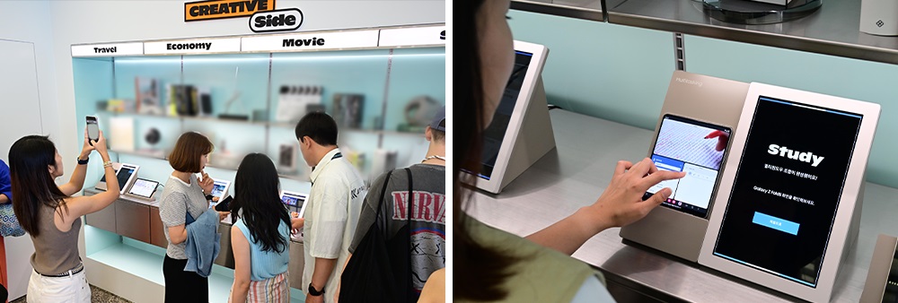 ▲ The Creative Side zone, a bookstore-like space, is filled with visitors exploring the Galaxy Z Fold5’s multitasking features