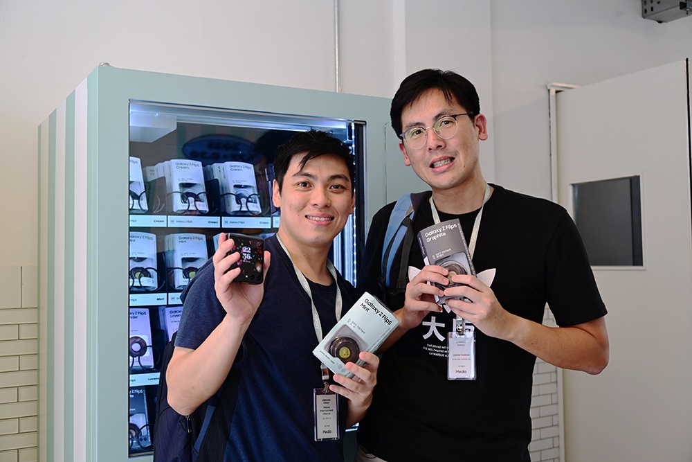▲ Media 8World Entertainment Lifestyle’s Jia Haur Lim and Lianhe Zaobao’s Slow Wee Dennis Ng, both from Singapore, pose in front of Flip Side Market vending machines with GS25 collaboration merchandise.