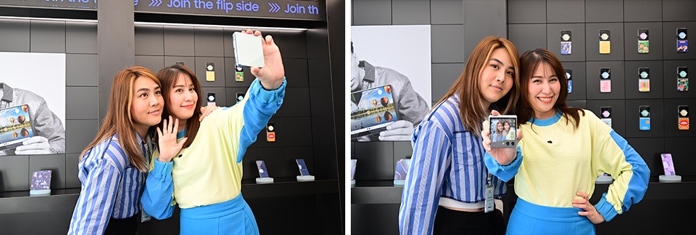 ▲ Sasikarn Pongsalee and Chatpawee, the influencers of the Thai tech channel “Ceemeagain,” take a selfie using Flex Window on the Galaxy Z Flip5