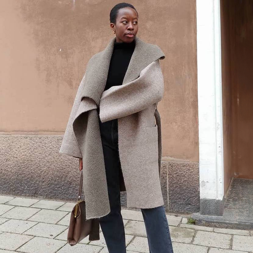 European fashion influencer Sylvie Mus poses on a Paris sidewalk with an oversize neutral coat, black mock neck top, jeans, and a brown bag