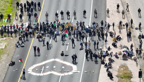The protest was part of A15, a day of action initiating a worldwide economic blockade to display solidarity with the Palestinian people in Gaza who have suffered over 30,000 lives lost and to call for the end of aid to Israel by the United States. It was set for Monday to coincide with it being the final day for U.S. citizens to submit their taxes. Other protests occurred on the Brooklyn Bridge in New York City, as well as at O’Hare International Airport in Chicago and Seattle-Tacoma International Airport.