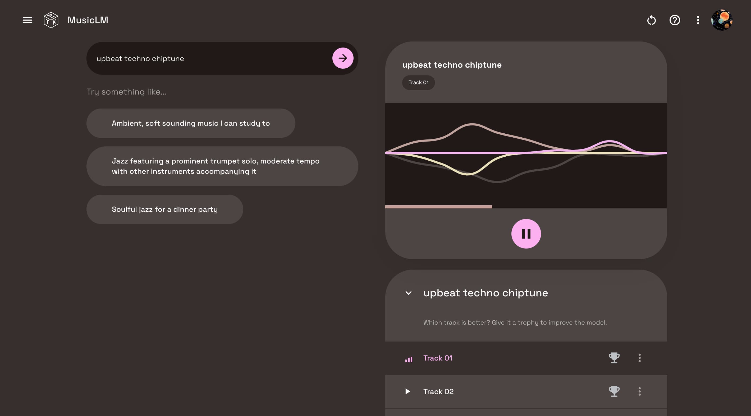 It takes a few seconds for your prompt to generate. You get two or so options with a waveform and the ability to download your creation from the overflow menu. Google asks you to rate which one is better to improve the MusicLM model.
