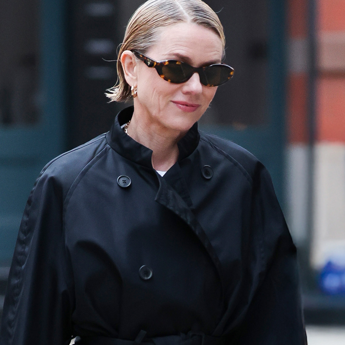 Naomi Watts wearing a Prada trench coat, jeans, heels, and a black brushed leather bucket bag in New York City.